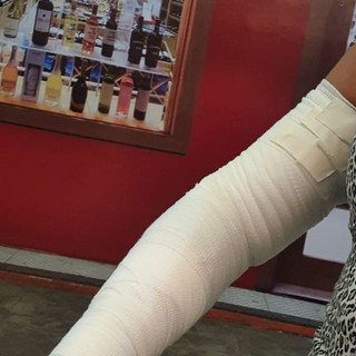 Engatei nas aulas de natação no mar e antes do Natal fiz uma travessia do Posto seis ao Leme, nadando com a desenvoltura de uma girafa no mar. Fiquei me sentindo empoderada com a façanha, tão pouco tempo depois de me livrar da quimioterapia. Naquele dia, fazia uns cinquenta graus na sombra, um calor duzinfernos. Cheguei em casa e notei que estava toda inchada, mas o braço esquerdo, aquele do esvaziamento axilar que eu fui tão relutante em fazer, estava muito inchado. Bateu o pânico do linfedema, era tudo que eu não queria pro meu final de ano. Eu me tranquei no ar condicionado, com os braços pra cima, apoiados numa pilha de almofadas, e só saí de lá no dia seguinte, quando o braço desinchou um bocado. Nesse dia, morri de dó do João porque, mais uma vez, eu não pude ajudar no final de semana que ele mais trabalhou fazendo panetones. Ele não decepcionou e se virou nos trinta sozinho. Na mesma semana, procurei a melhor fisioterapeuta oncológica do planeta, Dra AK, que não achou que aquilo tinha cara de linfedema, mas inchaço é inchaço e o tratamento não muda muito. Na dúvida, foi taping, drenagem linfática e braço enfaixado. Depois do meu fracasso em conseguir ficar mais de duas horas com as ataduras elásticas por cima de uma camada de Hipoglós, que me transformaram numa múmia moderna perdida no verão carioca, ela me orientou a usar uma malha compressiva para fazer atividades físicas. A tal luva, que vai da mão até o suvaco, é a mistura de uma meia Kendall bem grossa, daquelas pras varizes mais rebeldes, com uma meia Vivarina, que não corta nem com as facas Guinso 2000. A malha é fresca como uma máquina de assar frango na padaria! Fui obediente, passei a usar a malha toda vez que ia pedalar, mas às vezes o calor me dava a sensação de que eu podia ter um mal súbito e fazer a passagem a qualquer momento. Abaixo os estágios da tentativa de tratamento do inchaço do braço.